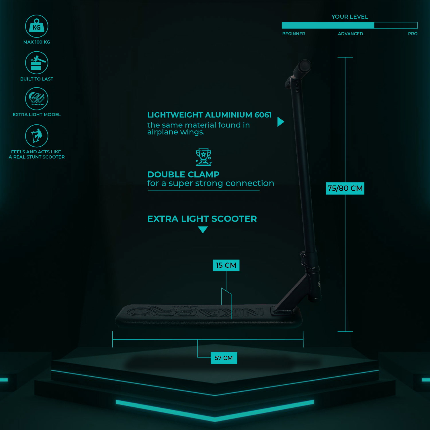 Tag dine trampolin tricks til nye højder med NKD Pro Lightweight Trampoline Trick Løbehjul – designet til tricks løbehjul kørere, der kræver det ypperste inden for kontrol, vægt og styrke. Med et EPX-forstærket dæk og styr i Aluminium 6061 T6, leverer denne scooter ekstrem holdbarhed og en ultralet følelse, der gør hvert trick skarpere, hurtigere og mere kontrolleret.
