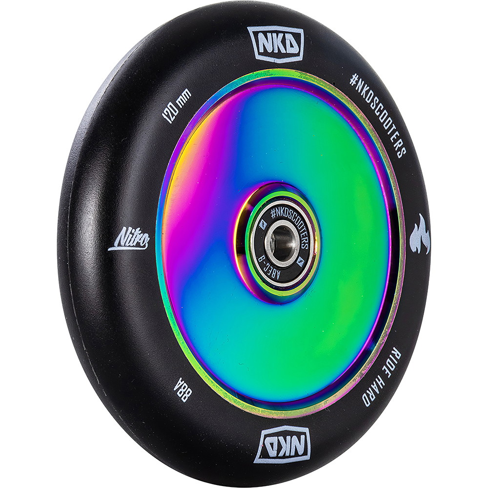 NKD nitro løbehjuls hjul er et hollow design (altså et design med hulrum i midten af hjulet), det gør det let og stadig holdbart. Hjulet er lavet af aluminium og har en hårdhed på 88 A. Dette hjul findes kun i 120 mm. I hjulet sidder der ABEC-9 kuglelejer, som er rigtige gode. Hjulet har en smal hjulprofil.