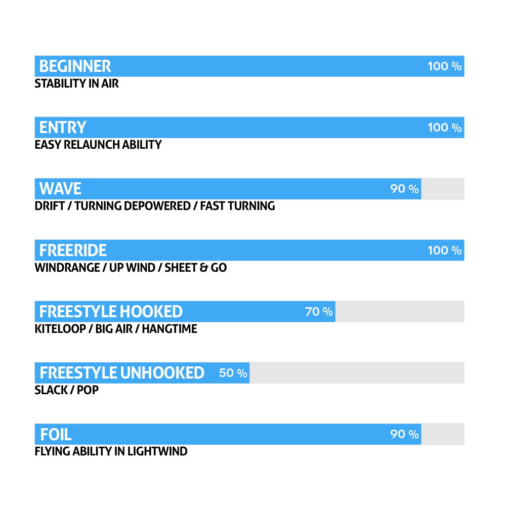 3-struts designet på NKX Vapor giver en markant stabilitet og præcis kontrol. Struts er de tværgående stænger i kiten, der understøtter dens struktur og påvirker dens performance. De tre struts skaber en stærk og stabil ramme, der forhindrer kiten i at deformere under høje hastigheder eller kraftige vinde. Dette sikrer en jævn og kontrolleret ride. Struts designet gør det lettere at styre kiten med præcision, hvilket giver dig en følelse af kontrol og sikkerhed. Du kan finjustere din manøvrering og hurtigt reagere på ændringer i forholdene.