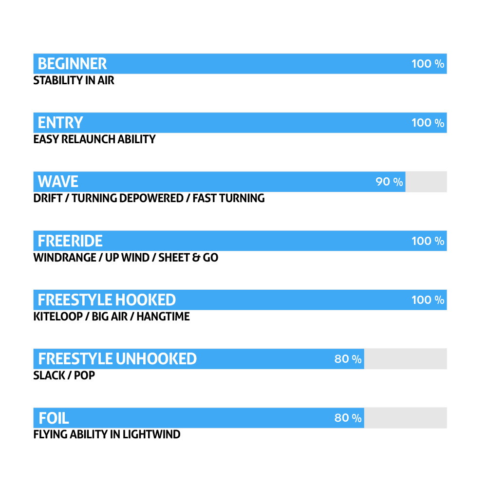 Kitens arodynamiske form er med til at give en ekstrem høj komfort og føling med kiten. Kitens leading edge er med til at optimere stabiliteten og gør det nemmere at manøvrere med.