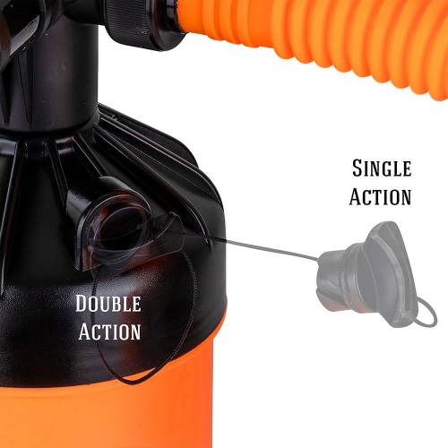 Denne pumpe har både enkelt- og dobbeltvirkende pumpefunktioner. Enkeltvirkende tilstand er ideel til hurtigt at puste dit udstyr op med mindre indsats, mens dobbeltvirkende tilstand tillader mere effektiv pumpning, når der er behov for højere tryk.