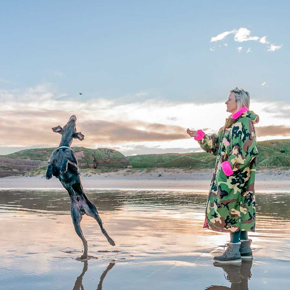 Dryrobe har et vandtæt og vindtæt yderstof og en beklædning der tørrer dig og holder dig varm. Designet giver masser af plads til at trække dine arme ind gennem ærmerne og skifte inde i den. Du kan nemt få en våddragt, svømme eller tri-kit, af eller på, nemt, mens du forbliver varm, tør og fuldt beskyttet mod elementerne.