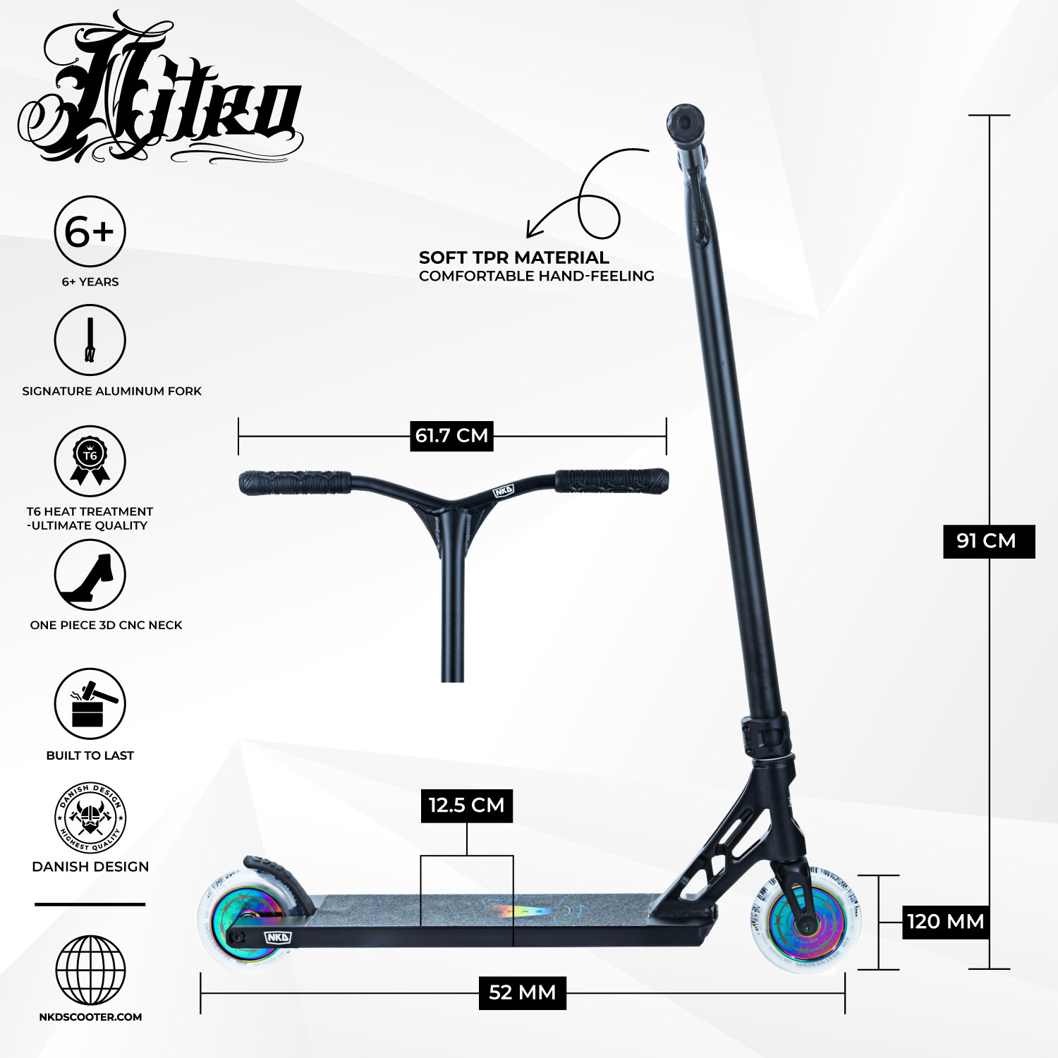 NKD Nitro er et CE-godkendt løbehjul, der er testet af NKDs professionelle teamriders, samt et fantastisk hold af dygtige ingeniører og designere. Et sikkert valg til enhver med interesse for sporten og som sætter pris på kvalitet og et stilrent design.