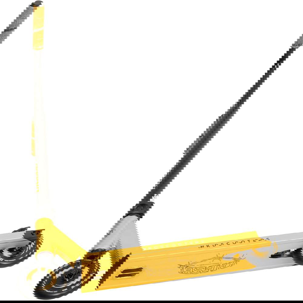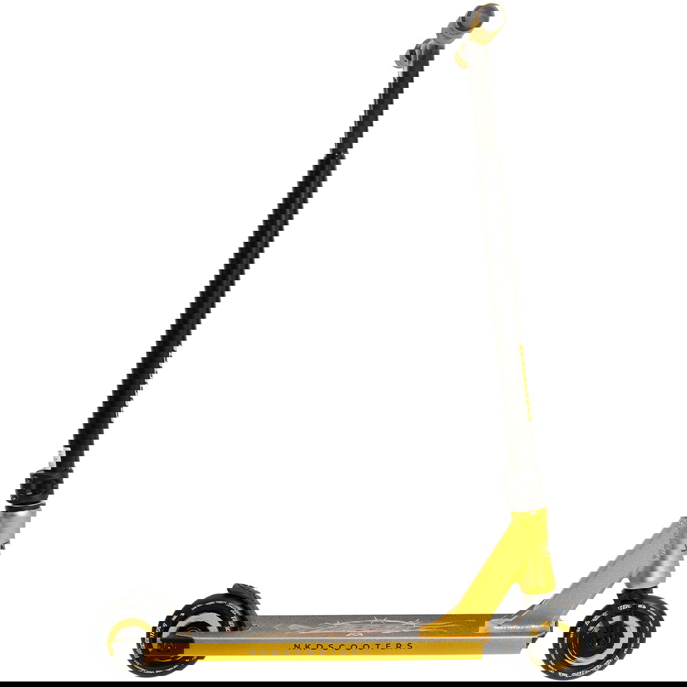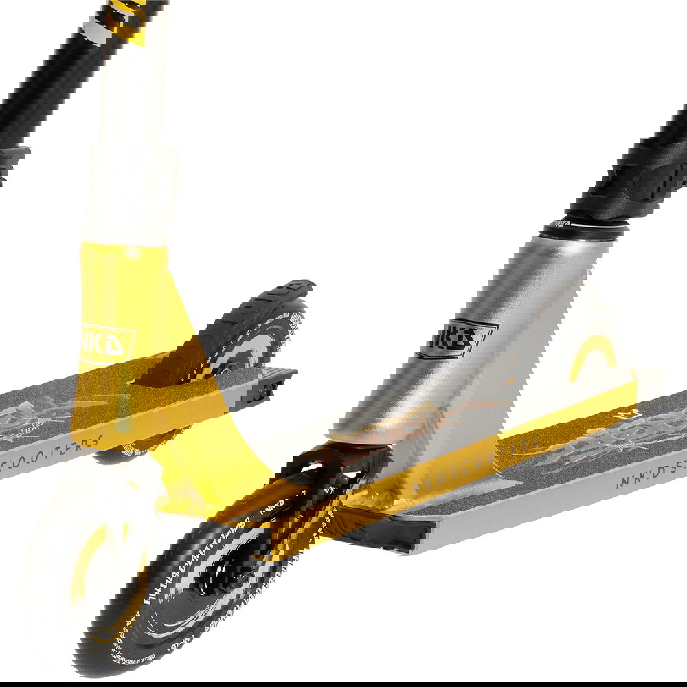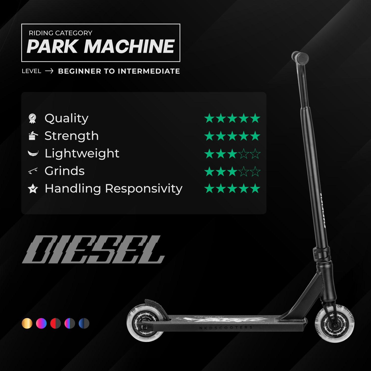 Konstruktionen for NKD Diesel løbehjulet består af en super stærk y-bar af stål og en neck, som er blandt de mest solgte og stærkeste necks på markedet. Hvilket blandt andet skyldes neckens evne til at klare stød ved hårde landinger af både tungere og lettere riders. Derudover har dette løbehjul til tricks også en Two-Piece forgaffel af forkromet stål, som kun medvirker til en endnu stærkere løbehjulskonstruktion. Alt så du kan gå helt amok med de vildeste af tricks i skaterparken. Som en anden egenskab, der sørger for at holde vægten en smule nede – har NKD Diesel et One-Piece aluminiums deck. Dette er lavet som et medium bredt deck, hvilket giver god plads for fødderne og gør dette kvalitets løbehjul perfekt til park og street tricks. Yderligere kan det nævnes at NKD Diesel løbehjulet har 120 mm Hallow Core hjul med en hårdhed på 88 A, som er lavet i et solidt hjul design med kernematerialet af aluminium. Alle disse egenskaber samlet medvirker til et par kraftige og hurtigrullende hjul med god komfort, der vil hjælpe dig med at opnå fart nok til de sygeste høje rampetricks.