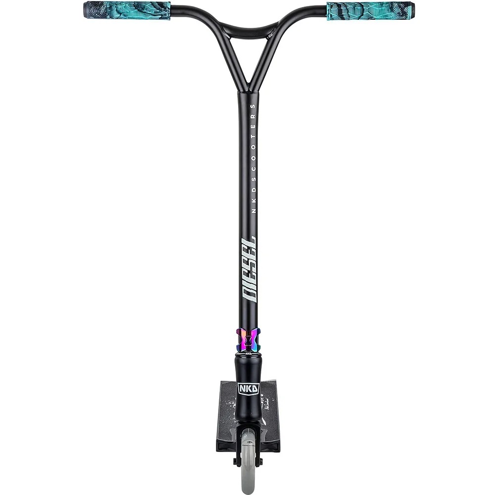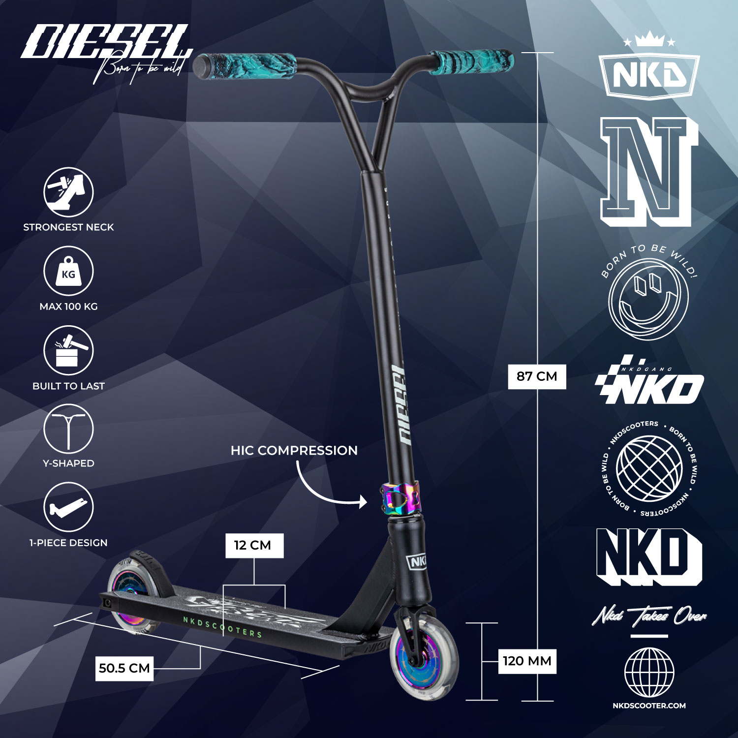 Konstruktionen for NKD Diesel løbehjulet består af en super stærk y-bar af stål og en neck, som er blandt de mest solgte og stærkeste necks på markedet. Hvilket blandt andet skyldes neckens evne til at klare stød ved hårde landinger af både tungere og lettere riders. Derudover har dette løbehjul til tricks også en Two-Piece forgaffel af forkromet stål, som kun medvirker til en endnu stærkere løbehjulskonstruktion. Alt så du kan gå helt amok med de vildeste af tricks i skaterparken. Som en anden egenskab, der sørger for at holde vægten en smule nede – har NKD Diesel et One-Piece aluminiums deck. Dette er lavet som et medium bredt deck, hvilket giver god plads for fødderne og gør dette kvalitets løbehjul perfekt til park og street tricks. Yderligere kan det nævnes at NKD Diesel løbehjulet har 120 mm Hallow Core hjul med en hårdhed på 88 A, som er lavet i et solidt hjul design med kernematerialet af aluminium. Alle disse egenskaber samlet medvirker til et par kraftige og hurtigrullende hjul med god komfort, der vil hjælpe dig med at opnå fart nok til de sygeste høje rampetricks.