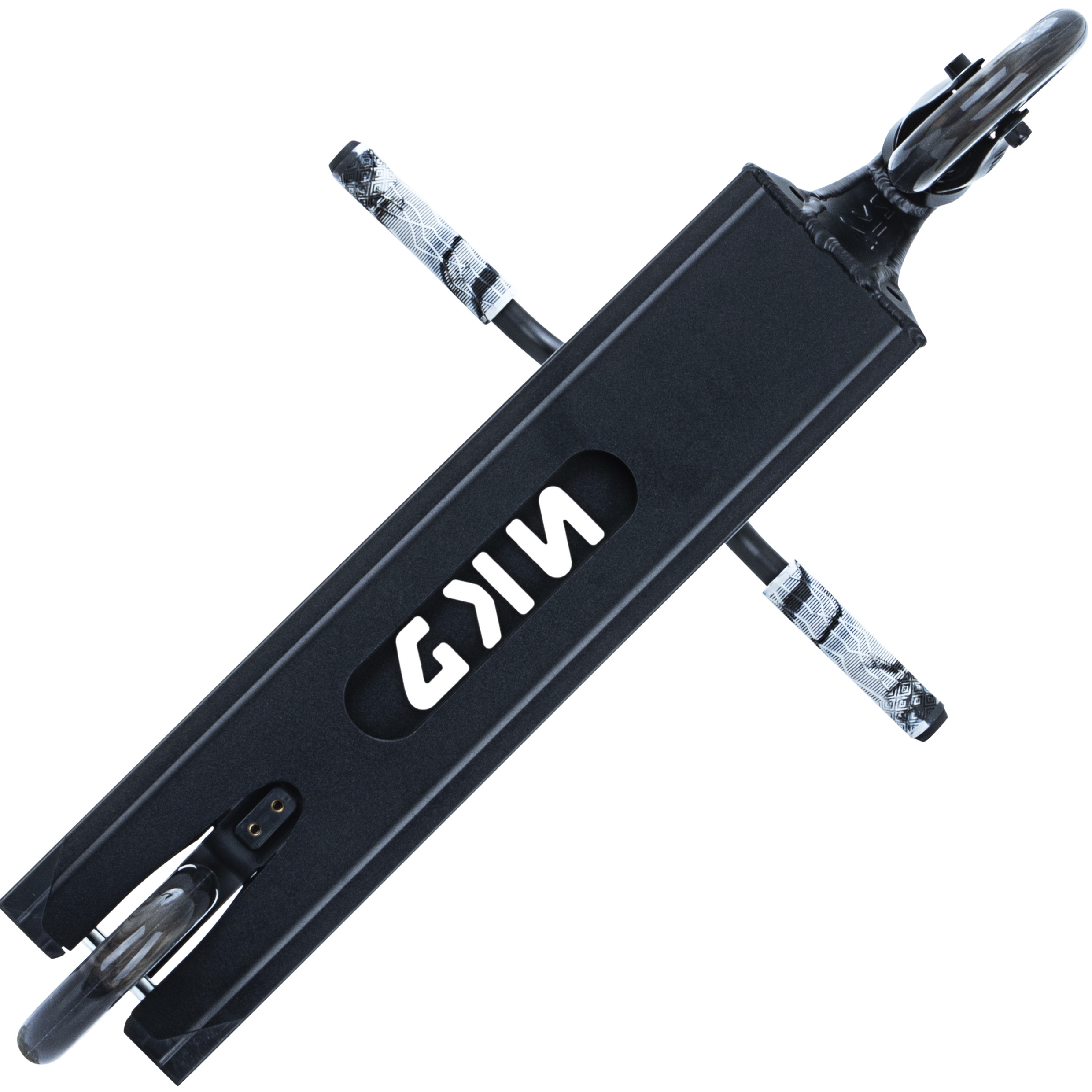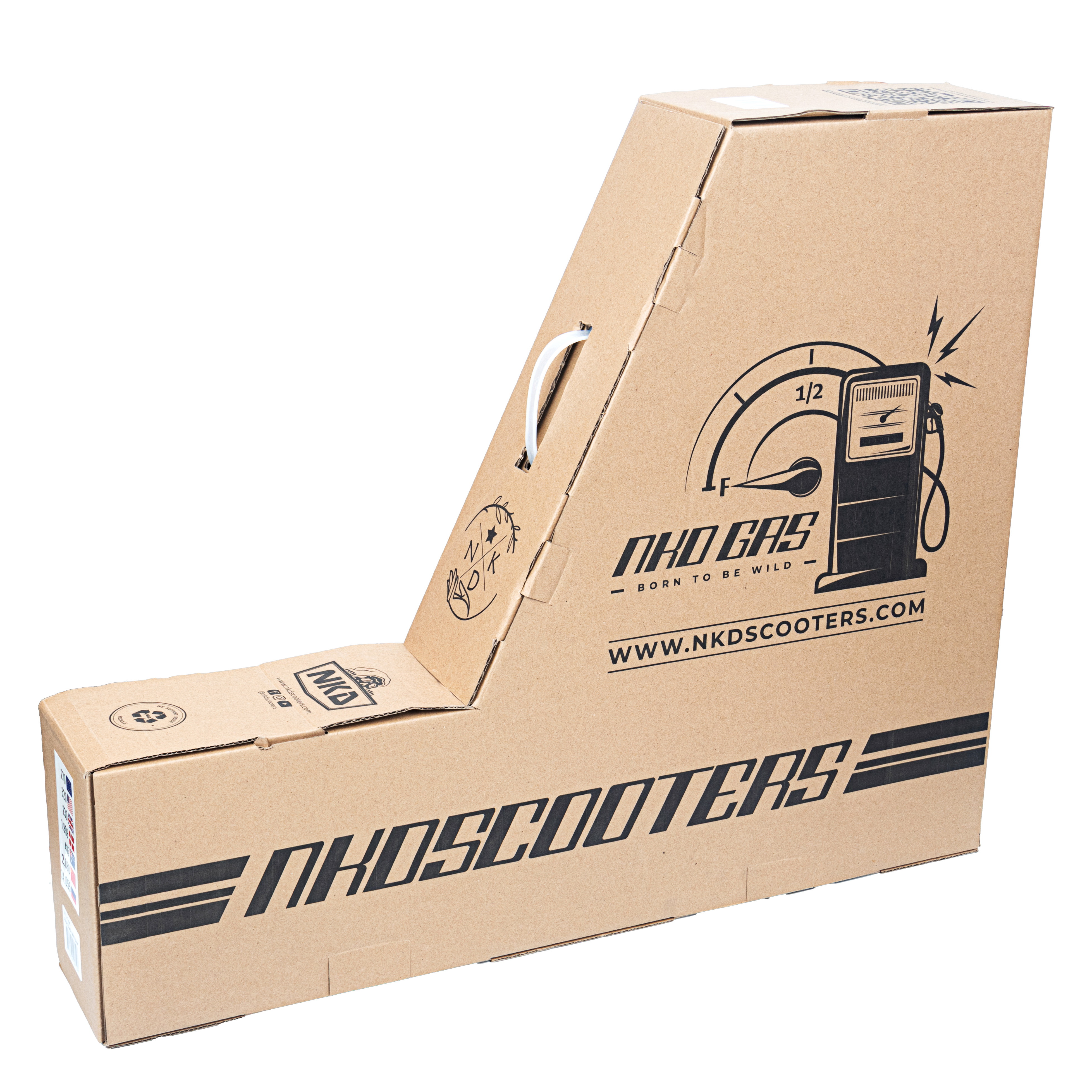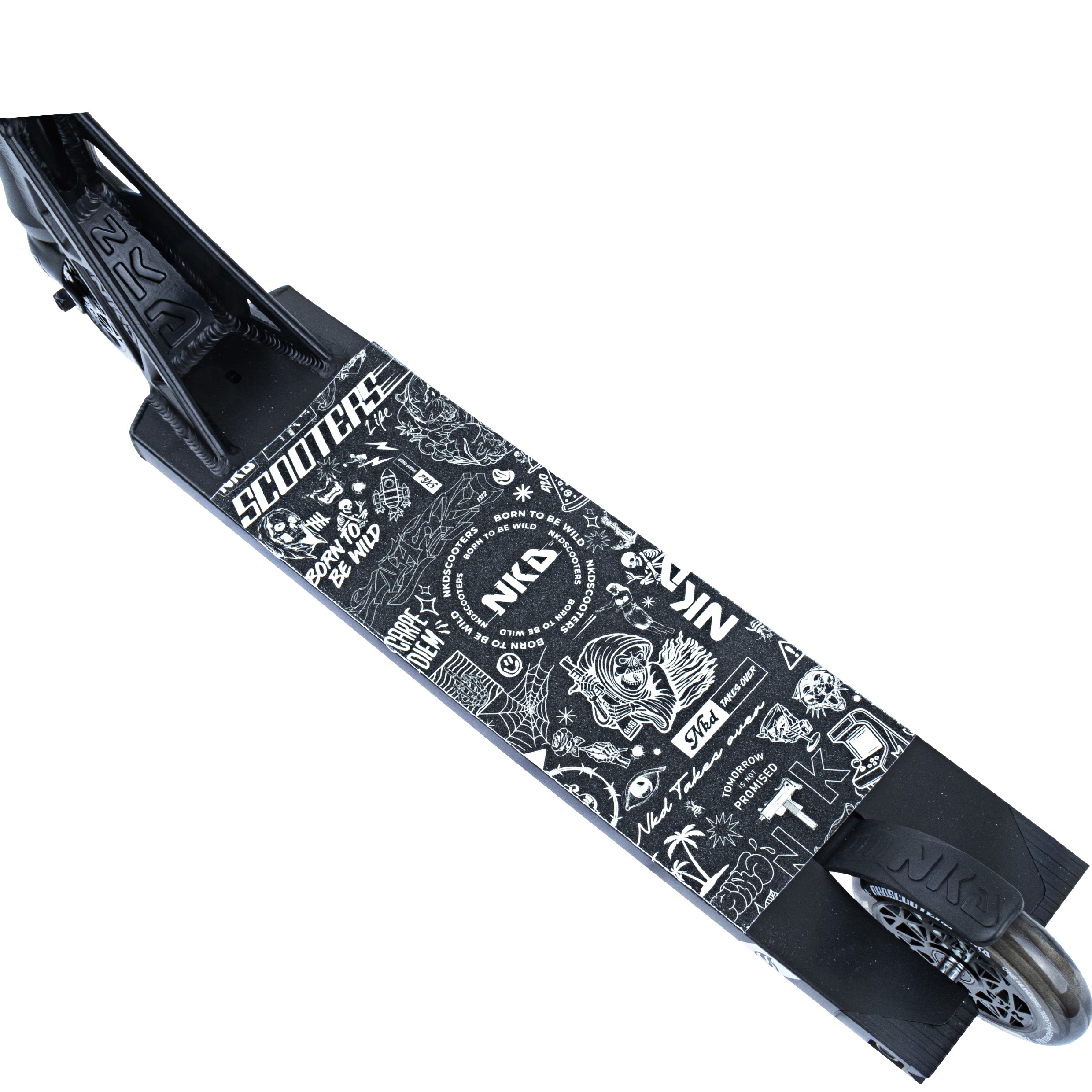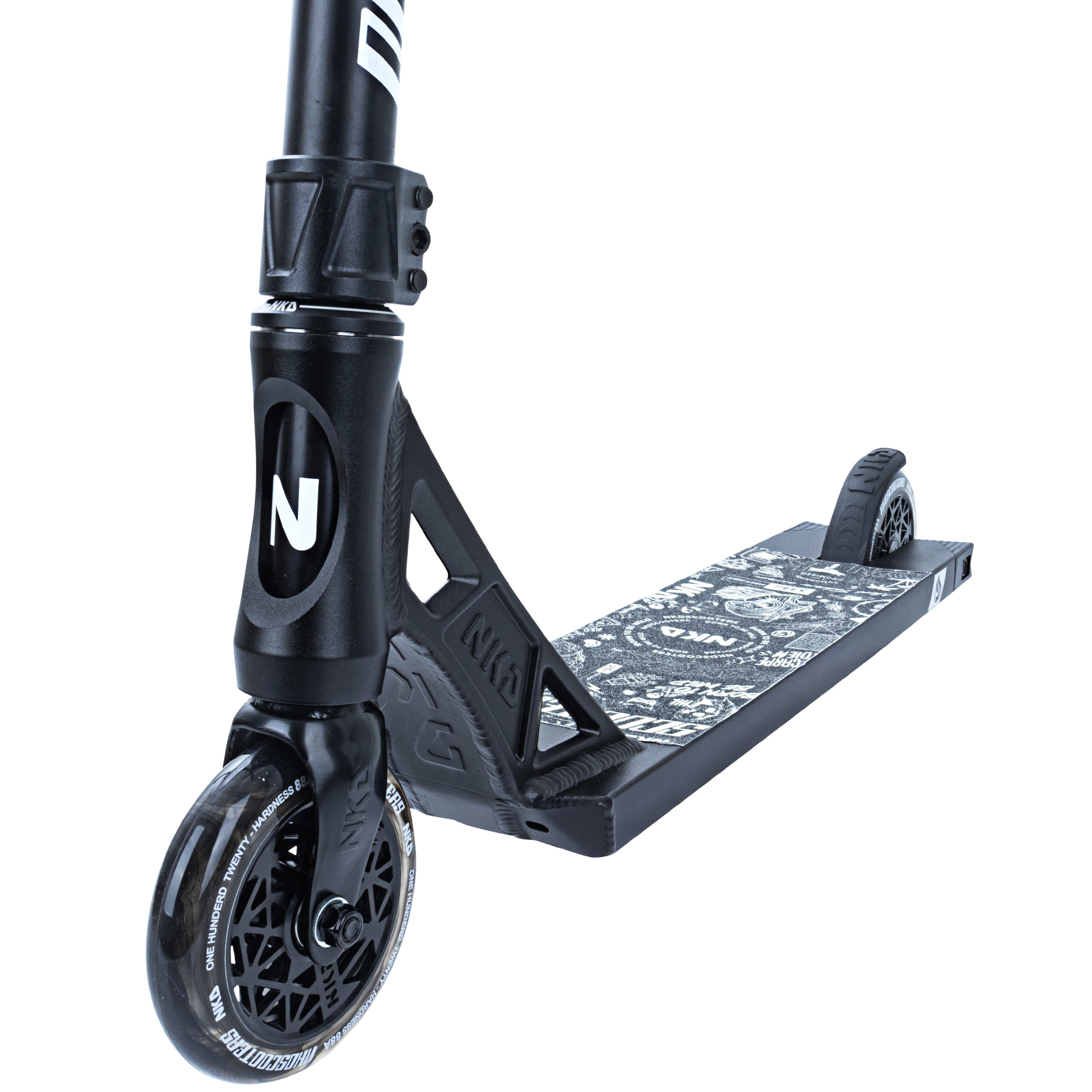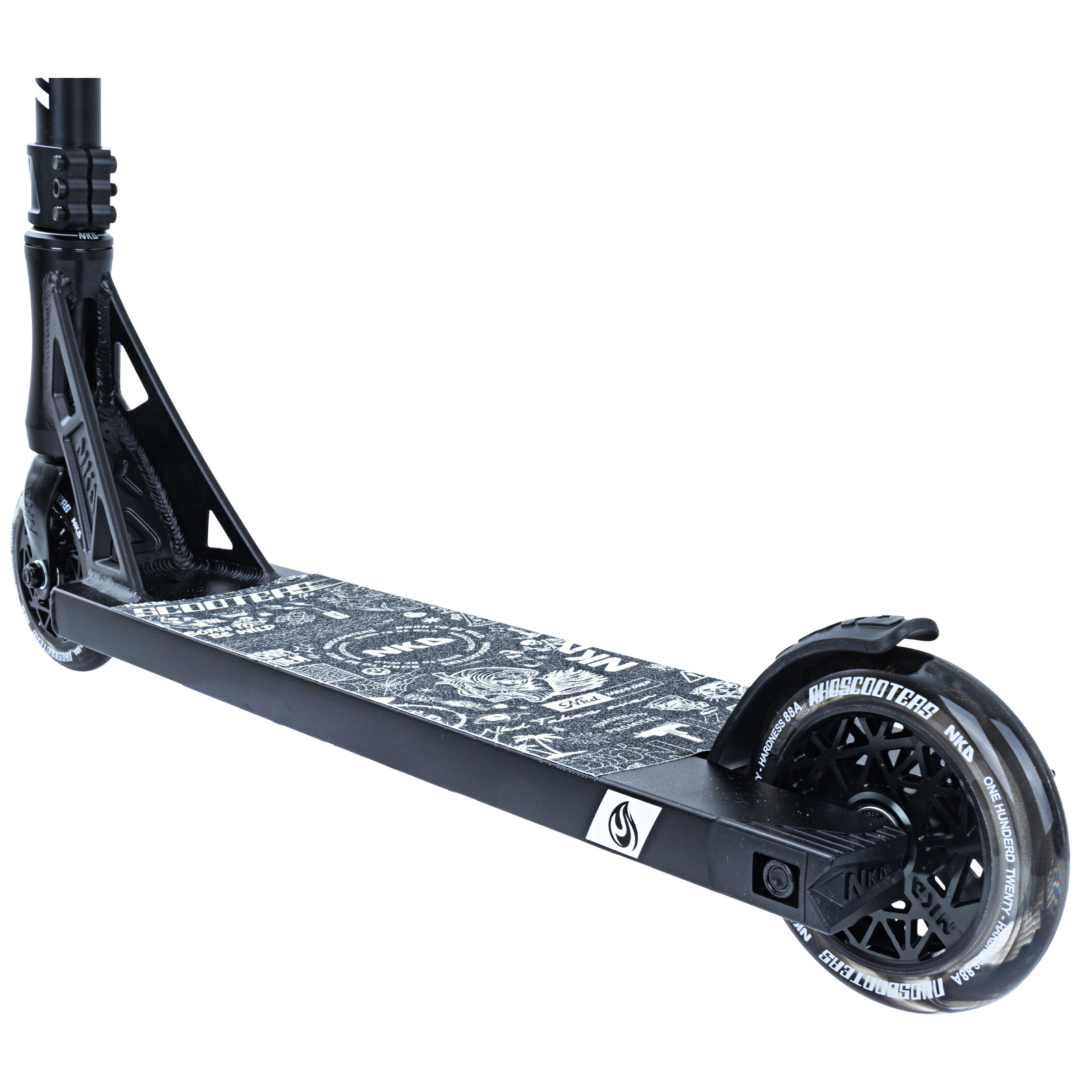 Dette komplette trick løbehjul er bygget op omkring NKD Gas decket 12cm x 50cm (4.7” x 19.7”). Med boxcut end-plugs og flotte store headtube udskæringer følger decket de seneste modetrends indenfor løbehjul. ‘Gas’ decket er den ihærdige lillebror til UFO decket fra NKD-scooters. Dette kan tydeligt ses med den nye unikke neck med æstetiske linjer og et råt look! Setuppet byder på den klassiske NKD Signature forgaffel som holdes sammen af et solidt HIC-kompressions system. Baren er en Y-bar med en tværgående forstærker. Løbehjulet er fast plantet til jorden med NKD’s nye super lette hollow core hjul med edderkoppe-lignende design (NKD™ Black Widow) - diameter 120mm for og bag. Setuppet toppes af med et solidt greb om de populære NKD Shadow grips.