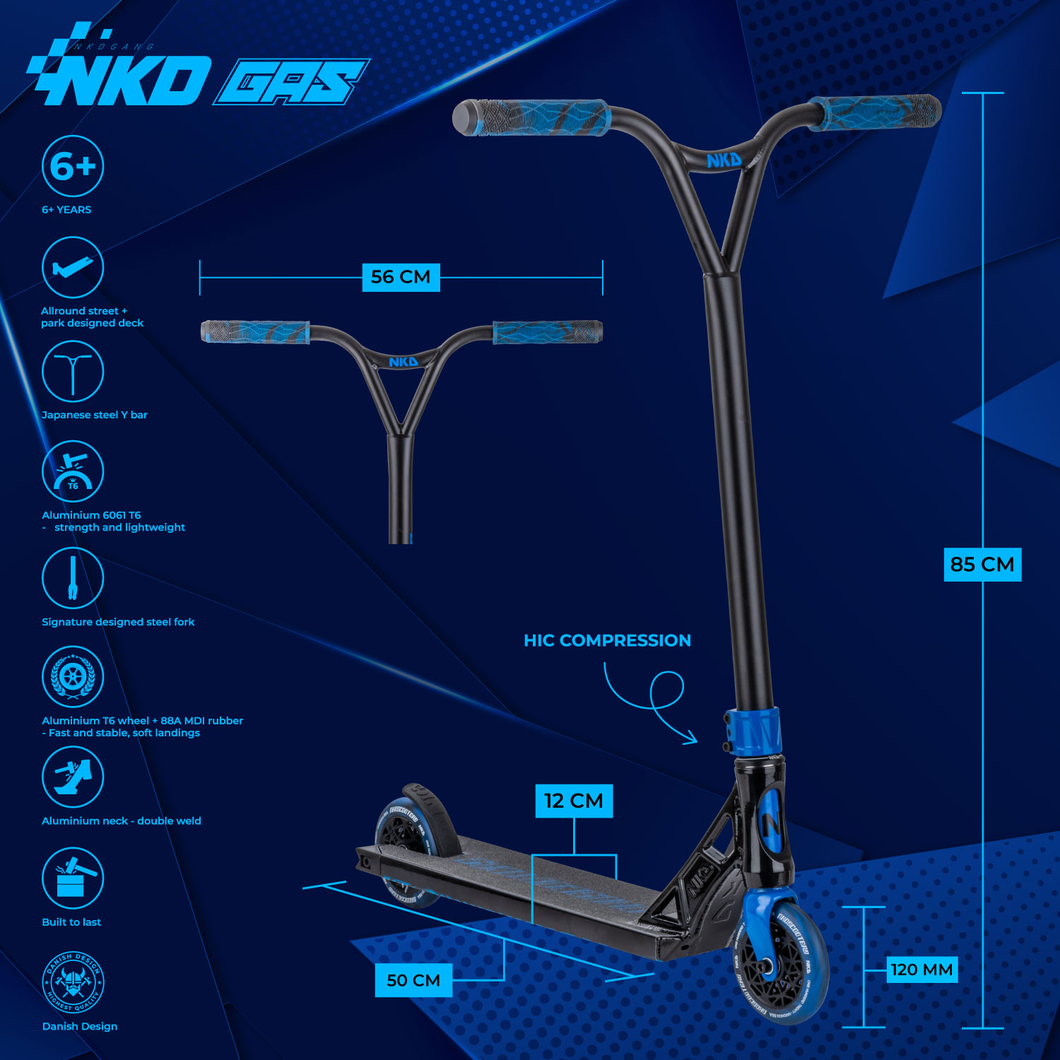 Dette komplette trick løbehjul er bygget op omkring NKD Gas decket 12cm x 50cm (4.7” x 19.7”). Med boxcut end-plugs og flotte store headtube udskæringer følger decket de seneste modetrends indenfor løbehjul. ‘Gas’ decket er den ihærdige lillebror til UFO decket fra NKD-scooters. Dette kan tydeligt ses med den nye unikke neck med æstetiske linjer og et råt look! Setuppet byder på den klassiske NKD Signature forgaffel som holdes sammen af et solidt HIC-kompressions system. Baren er en Y-bar med en tværgående forstærker. Løbehjulet er fast plantet til jorden med NKD’s nye super lette hollow core hjul med edderkoppe-lignende design (NKD™ Black Widow) - diameter 120mm for og bag. Setuppet toppes af med et solidt greb om de populære NKD Shadow grips.