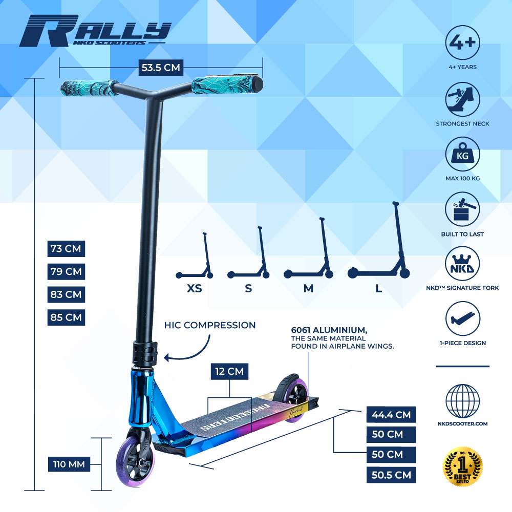 Er du klar til at få fejet benene væk under dig? NKD Rally trick løbehjulet er kommet for at erobre verden og det vil have dig med. Dette trick løbehjul kan køre på gaden og ramper, mens det slider på alt omkring sig, som var det det eneste det nogensinde har gjort. Det er perfekt til alle slags ridere, om du er begynder eller har kørt i flere år. Det er en blanding mellem styrke og lethed, med dets forkromet stål bar og brede aluminiums deck, med grind rails.