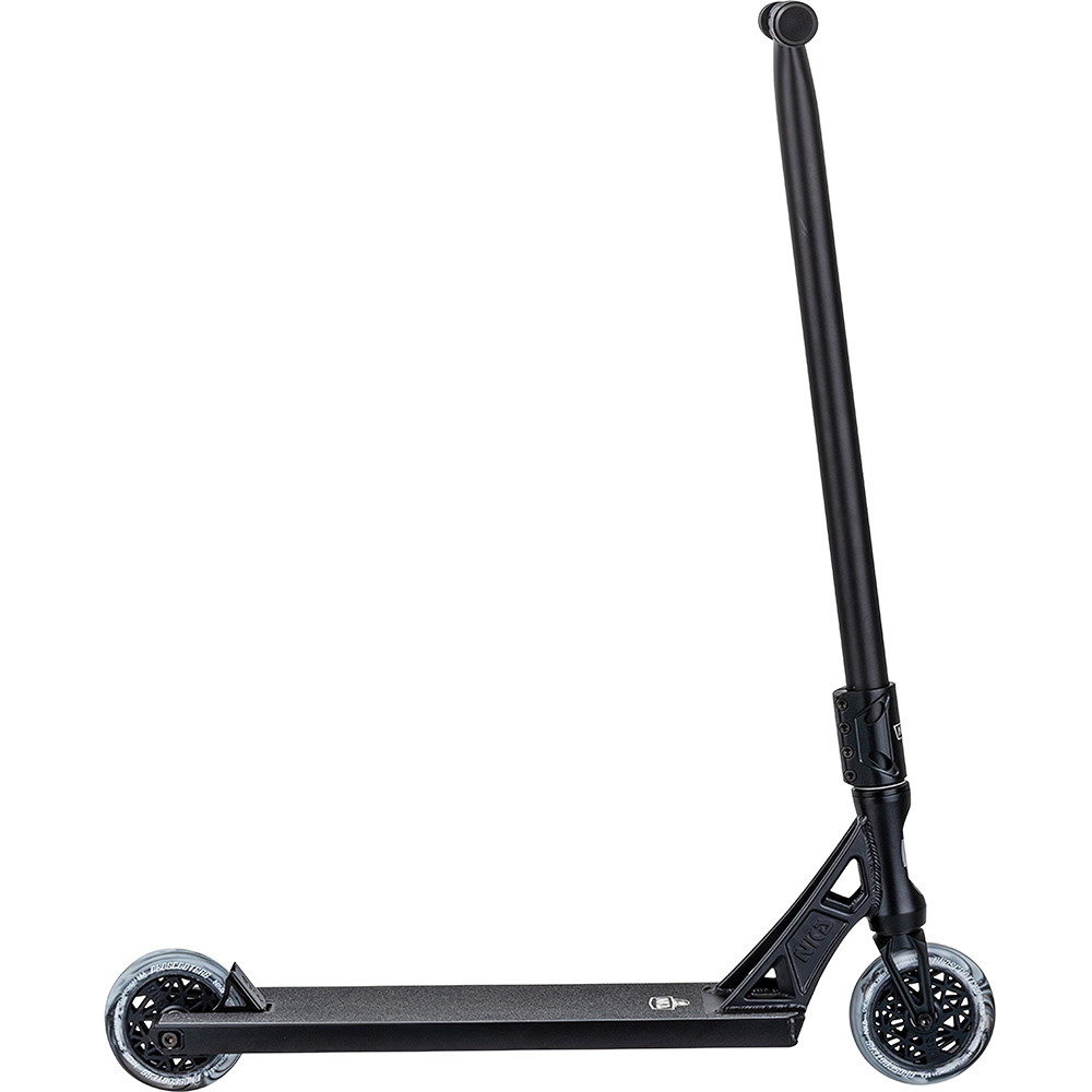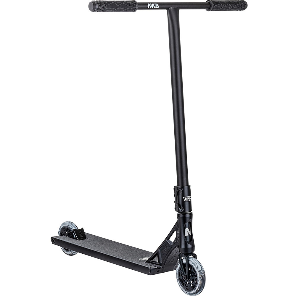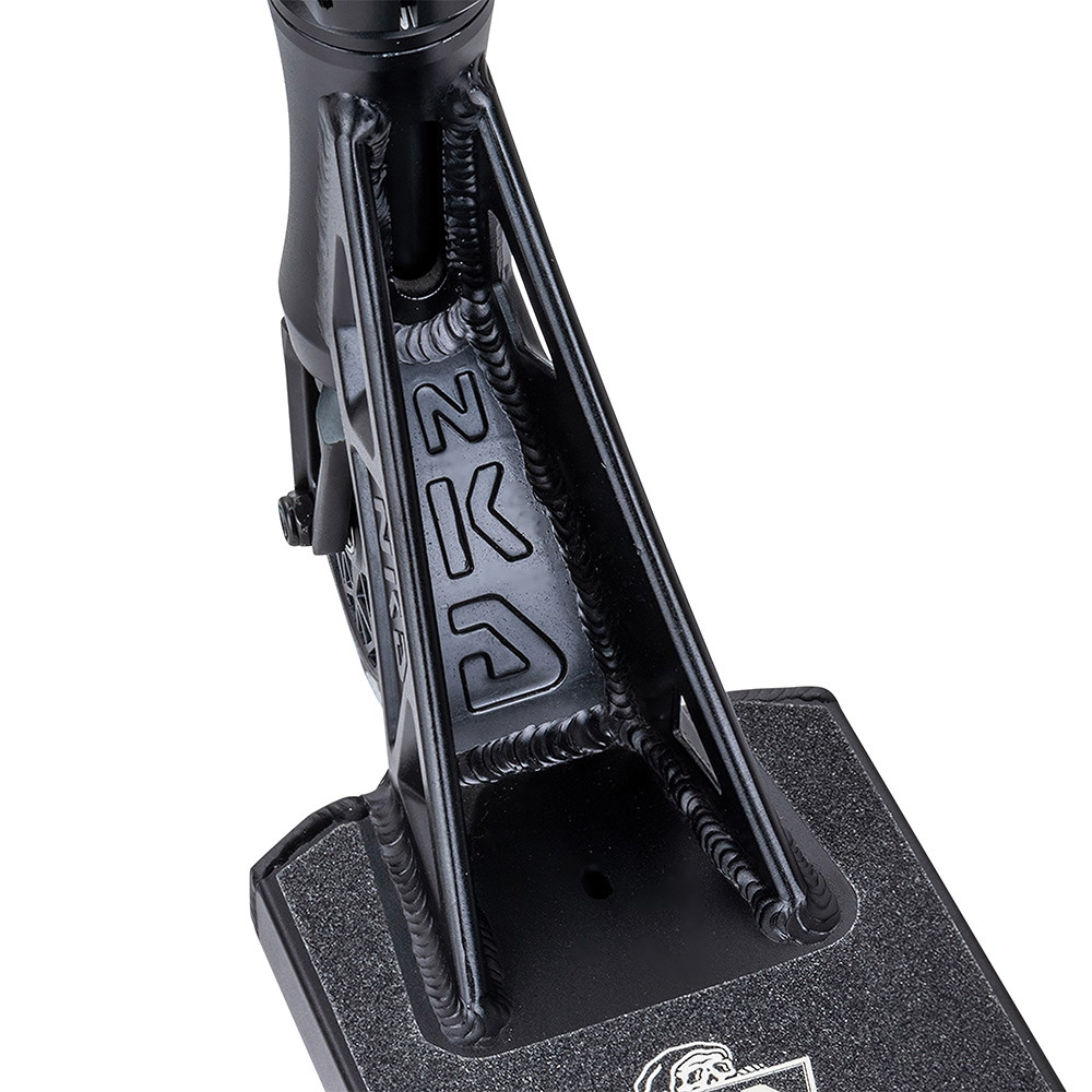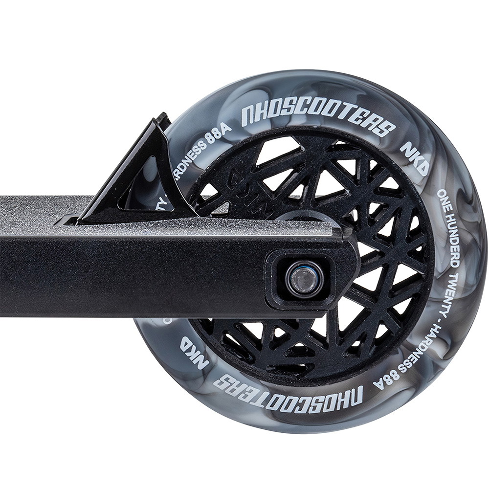 Dette komplette trick løbehjul er bygget op omkring NKD’s nye 14cm (5.5”) bredde UFO deck. Deckets design byder på en solid boxcut platform samt headtube cutouts, men også den nye og unikke UFO neck med æstetiske linjer og et råt look! NKD UFO er sat op med NKD Pro SCS kompressions clamp og 59cm bred oversized stålbar T-bar. Løbehjulet er fast plantet til jorden med NKD’s nye super lette hollow core hjul med edderkoppe-lignende design (NKD™ Black Widow) - diameter 120mm for og bag. Setuppet toppes af med et solidt greb om de populære NKD Shadow grips.