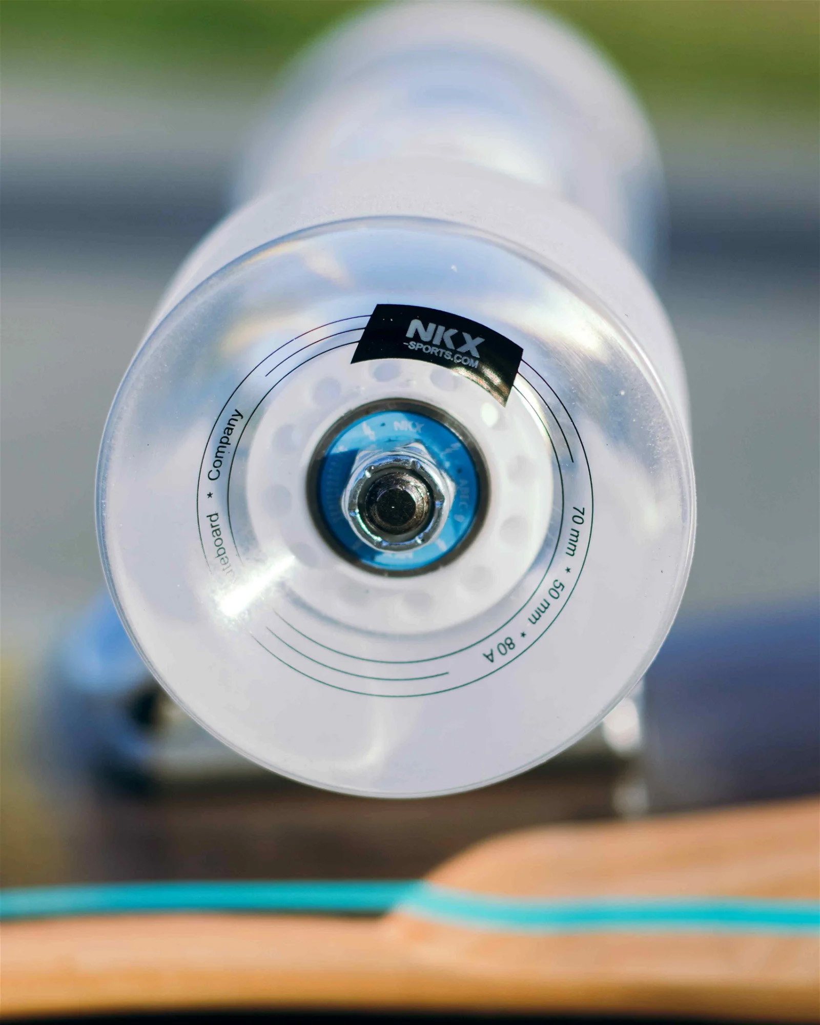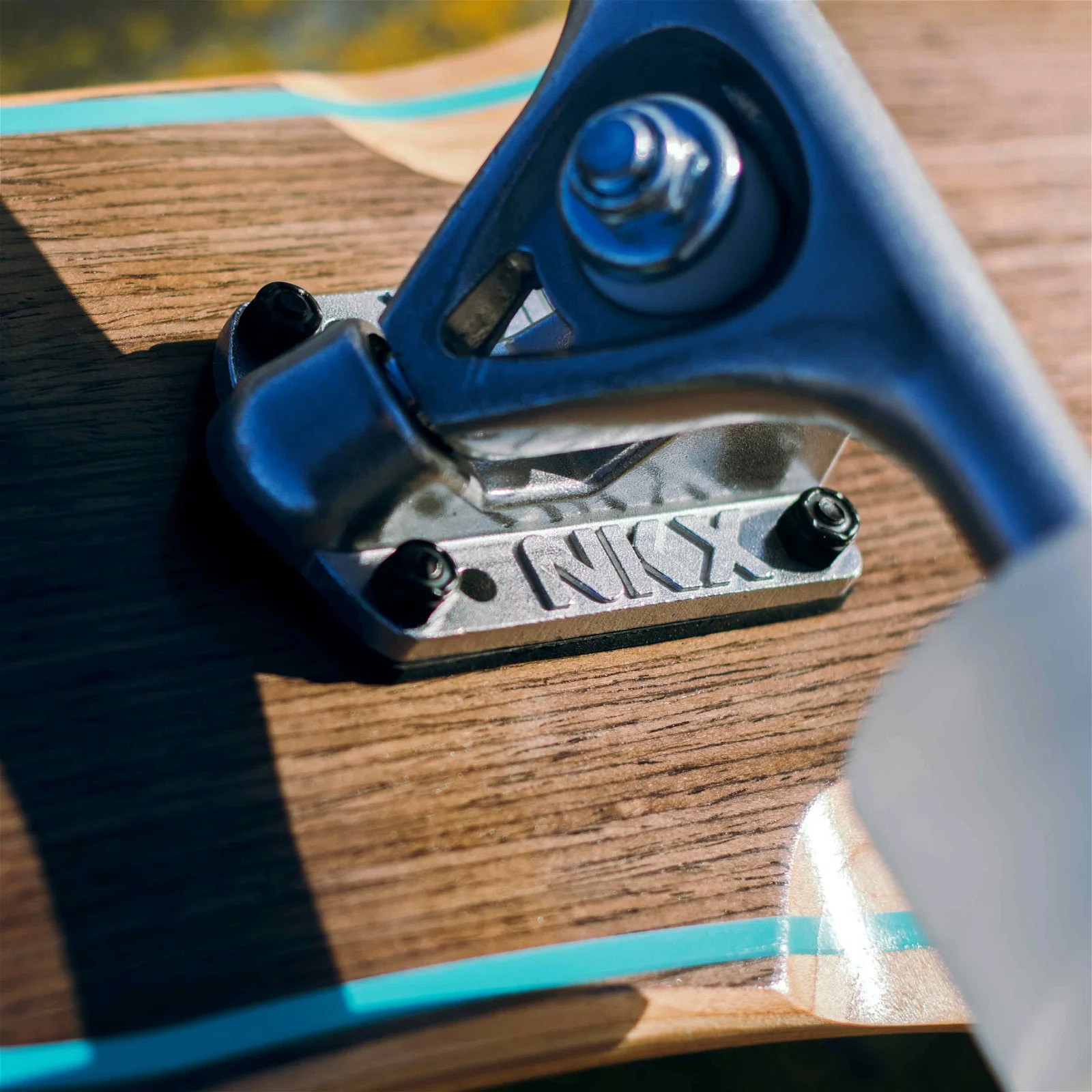 Sammen med deckformen med bløde kanter vil højkvalitetskomponenterne i NXK Geometric boards garantere stor kontrol og holdbarhed. Først og fremmest er 7-lags canadiske ahorndecket solidt og fleksibelt på samme tid og decket med et lag valnød på toppen og i bunden af brættet. De klassiske NKX Aluminium trucks garanterer dig stor kontrol, og de 50 mm squared edge hjul er bløde, men alligevel holdbare og kommer med højkvalitets ABEC-9 lejer. Takket være den gode hjuldæmpning, også øget af riser pads, vil du kunne køre på alle typer asfalt.